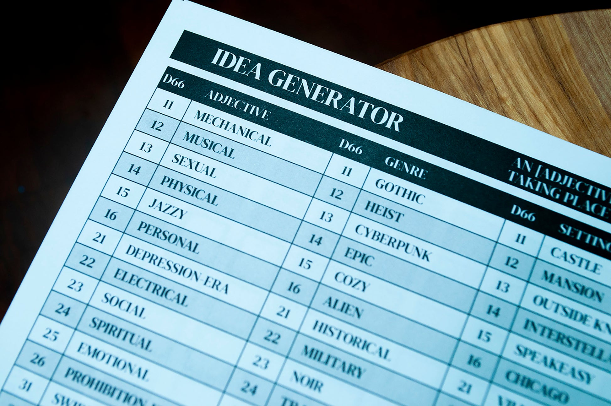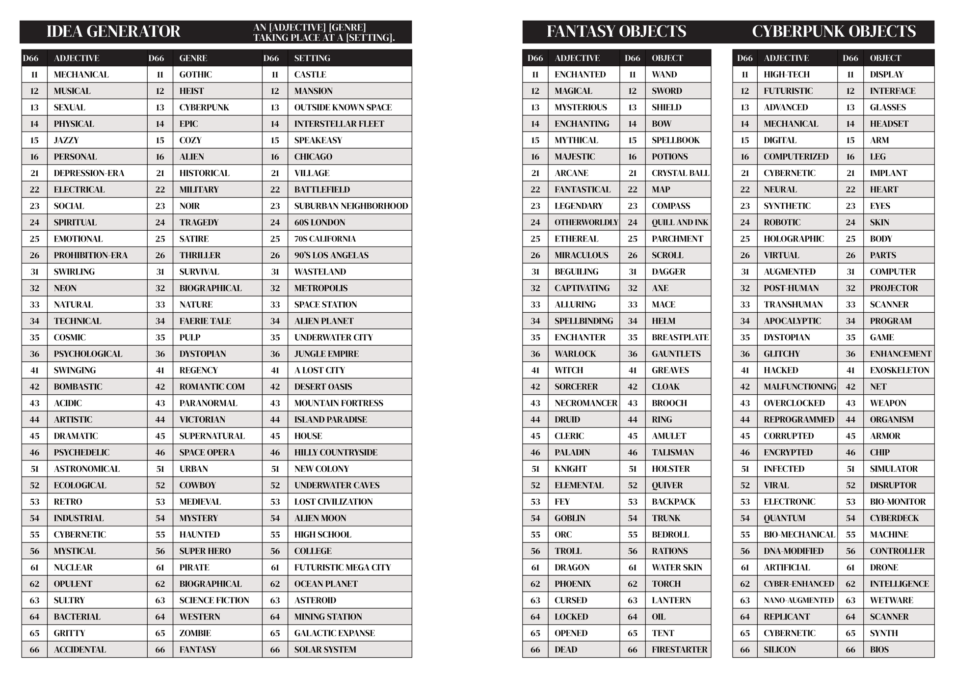 Most tables are ‘d66’ tables. To use them, roll two six sided die. One acts as the tens place, the other the ones place. For example, if you roll a 3 and a 6, look up the “36” position on the table.
