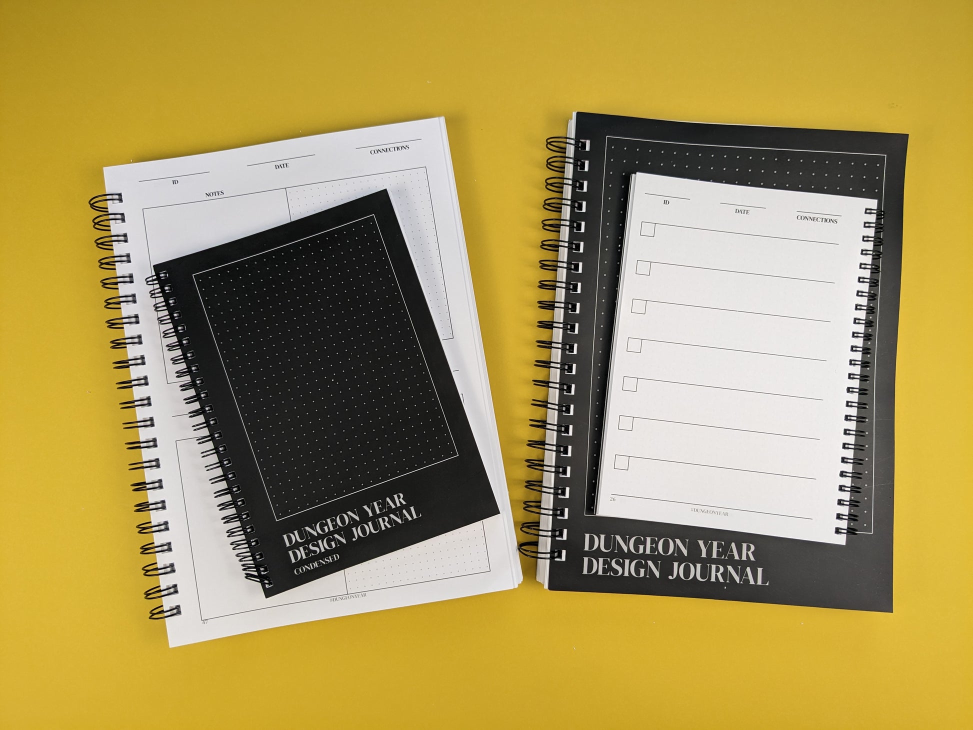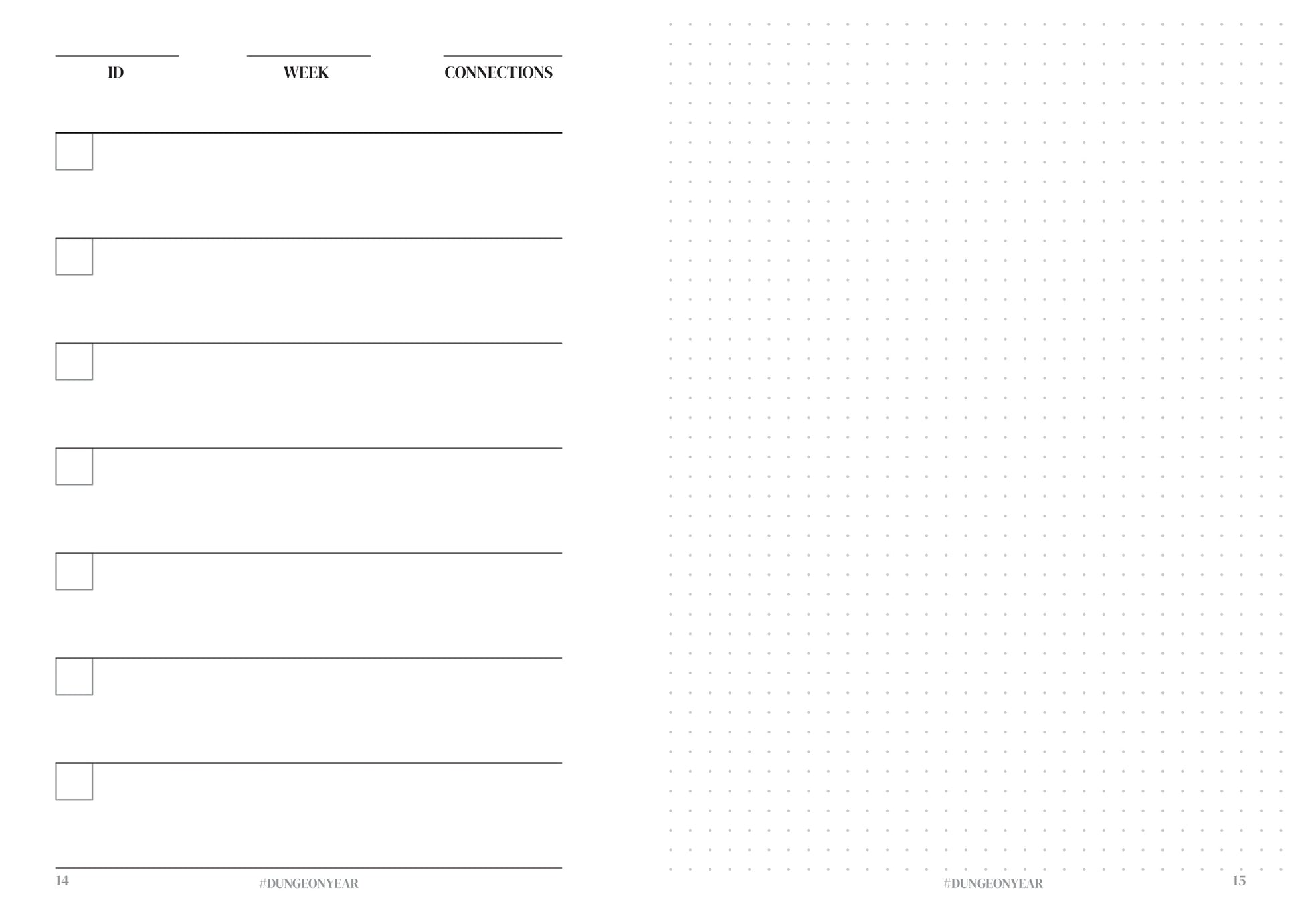The day entries are what makes up most of this journal. 365 entries in total. Each one has a place for you to write your notes, encounters, tables, or descriptions, and grid for drawing and sketching. At the top of each entry is a place for an ID, Date, and Connection.