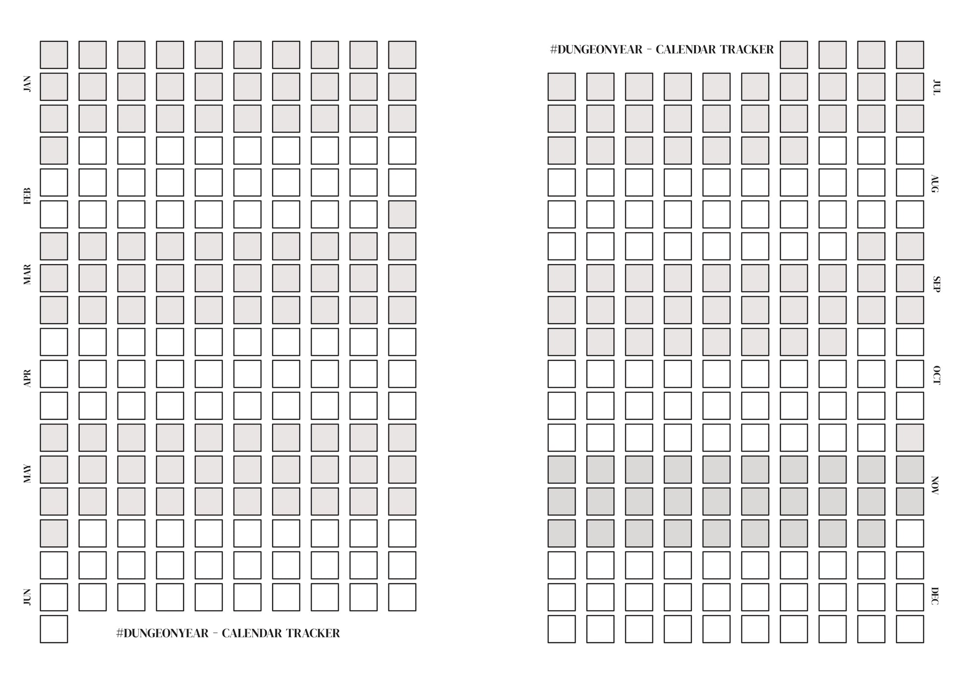 Each day that you work in your design journal, tick off a day on the tracker. We have designed the tracker to be used either as a simple counter, or as a calendar. How you use it is up to you. When you fill the tracker up, your Dungeon Year is complete.