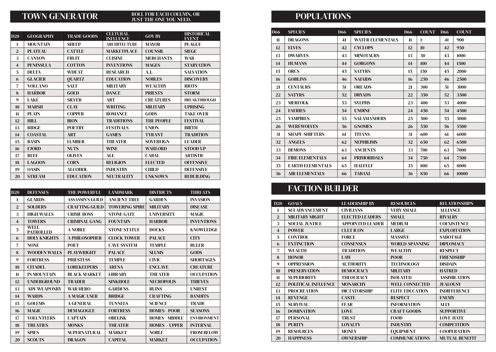 You can combine results from multiple tables! Whatever the outcome of rolling on a table, use what you like, and change or discard what you don’t. These resources are there to help you - not restrict you.
