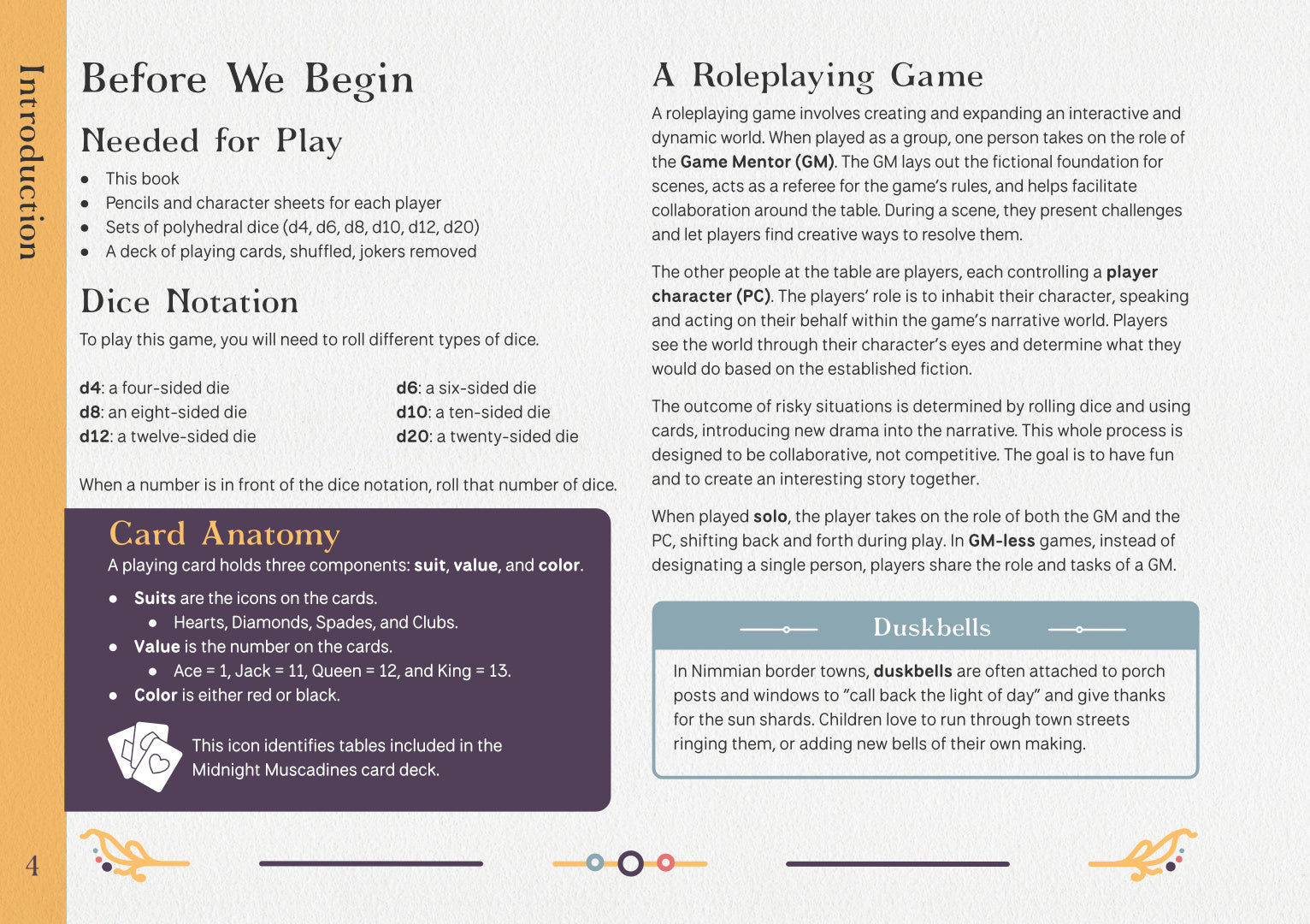 Midnight Muscadines is a solo+ TTRPG using dice and playing cards to explore a world with a shattered sun, survive the shadows that lurk, and craft deliciously powerful jams to keep the magic alive. It can be played solo, duet, GM-less, or with a traditional GM.
