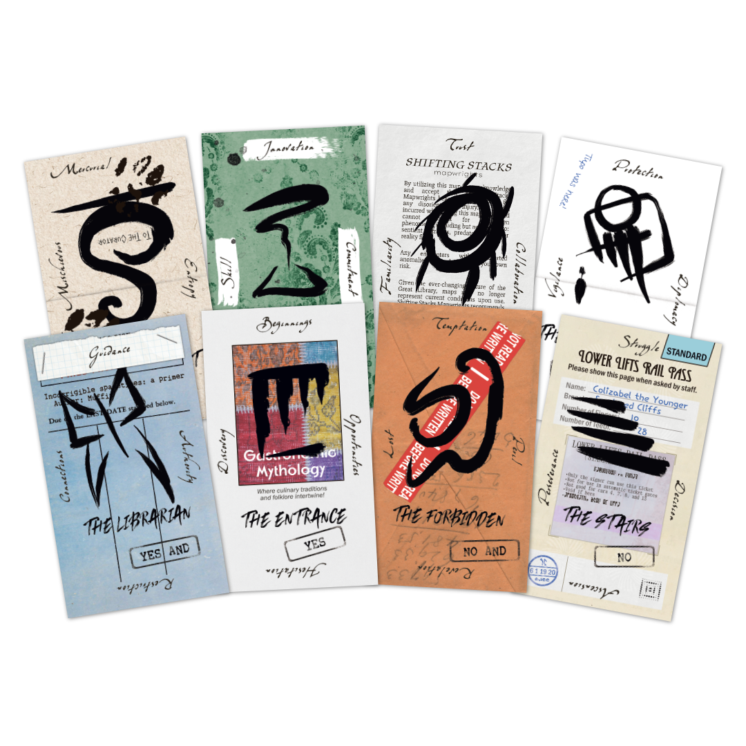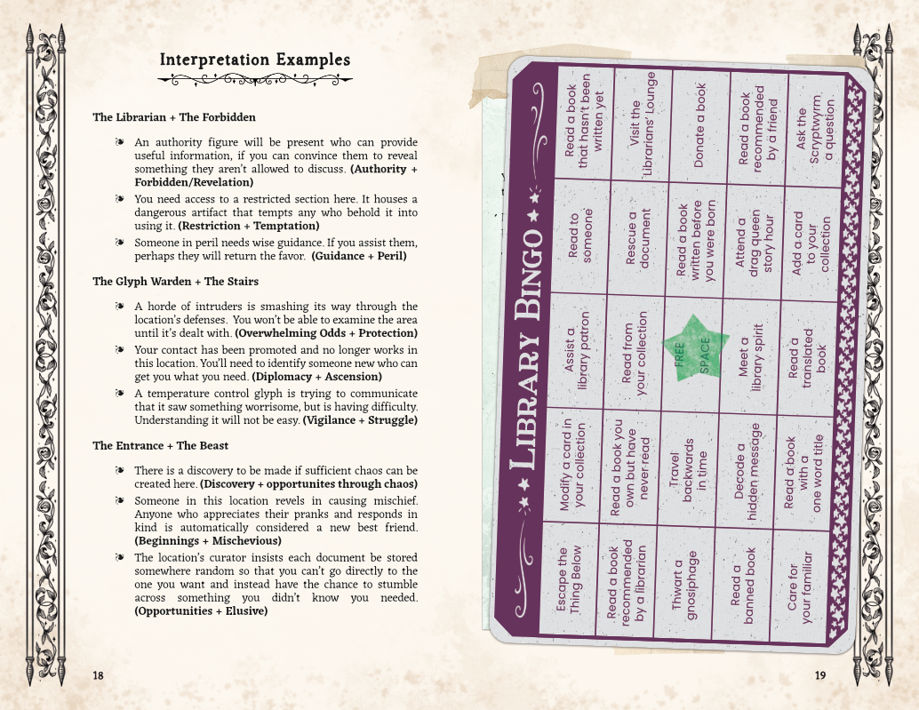 - Gather clues with the aid of your training as a Librarian's apprentice, your familiar, and your Collection - a small oracle deck that reinforces the themes of the Library.