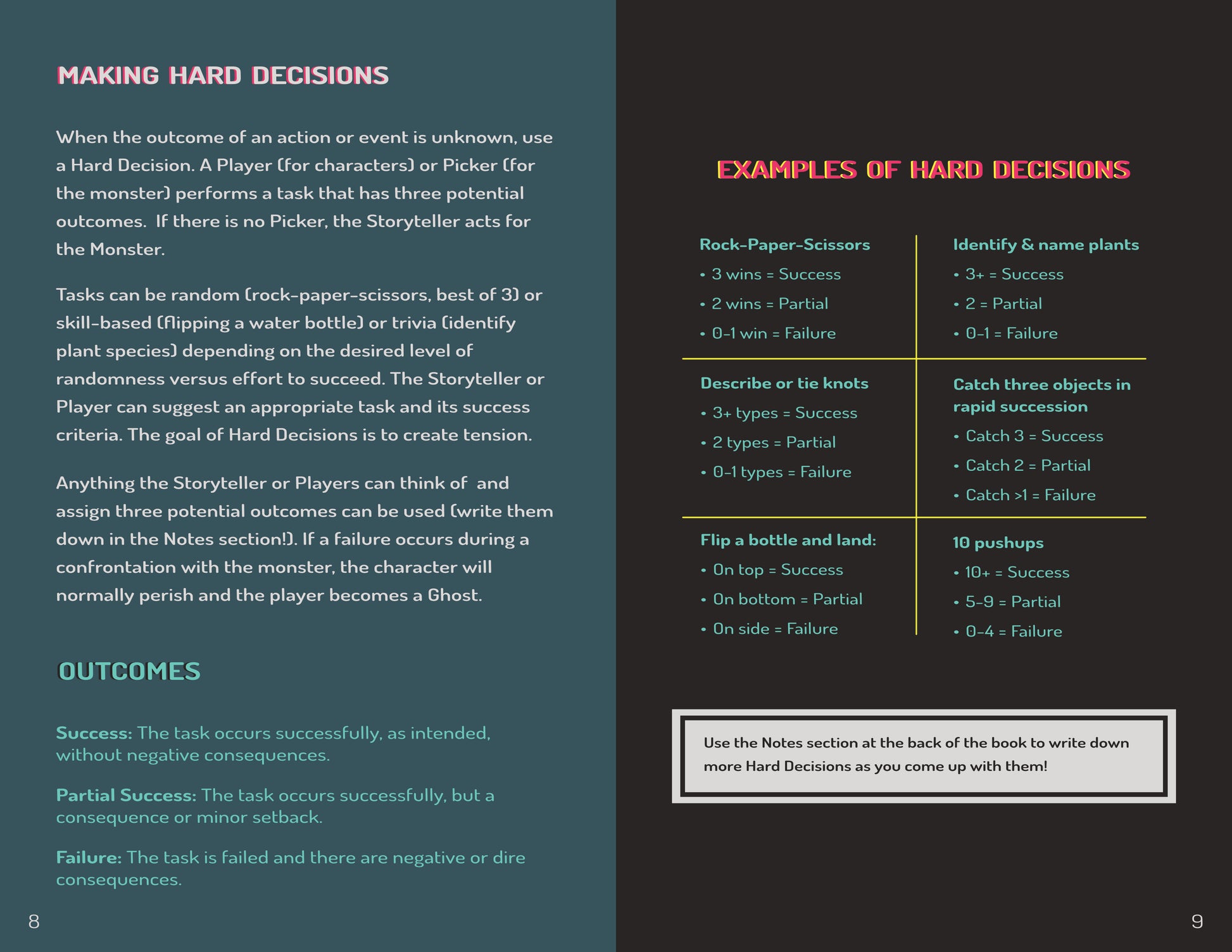 Set-up involves filling out a Story Prompt that consists of eight fill-in-the-blanks. Players can optionally fill out a Character Profile to define individual characters. This rule book provides a myriad of options for each, or you can come up with your own.