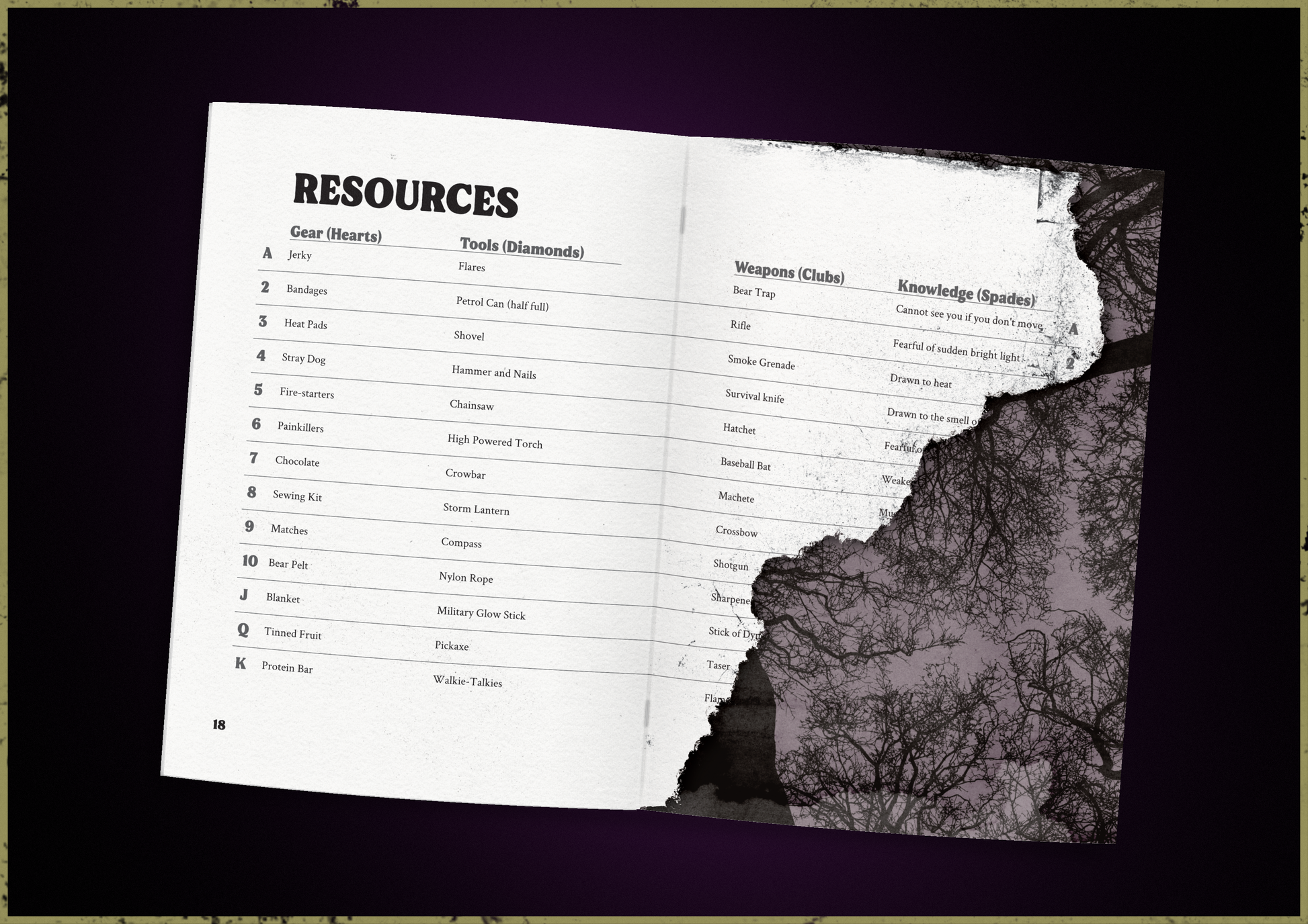 Your survivor must travel to up to 13 different locations in search for as many resources as they can. To do this they must overcome certain complications present at each location, by using one of their two skills; Survival or Awareness.