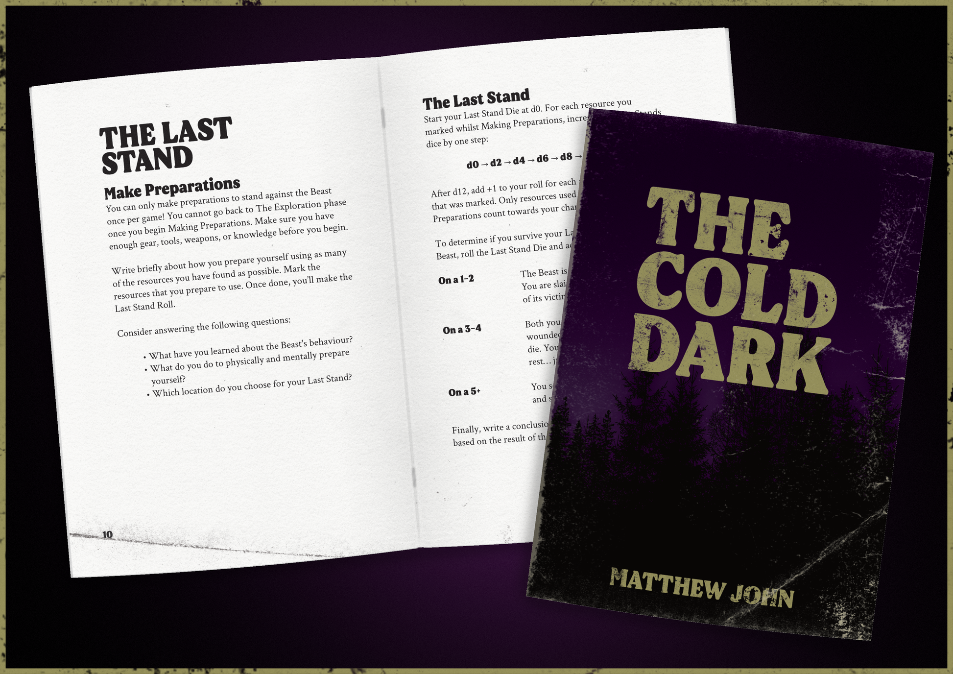 The Cold Dark is a solo journaling game about survival. You play a survivor lost in bleak, frozen wilderness after a storm brought down the plane you were in. Now, with your pilot dead and no one to help you, you must gather every resource you can to simply stay alive.
