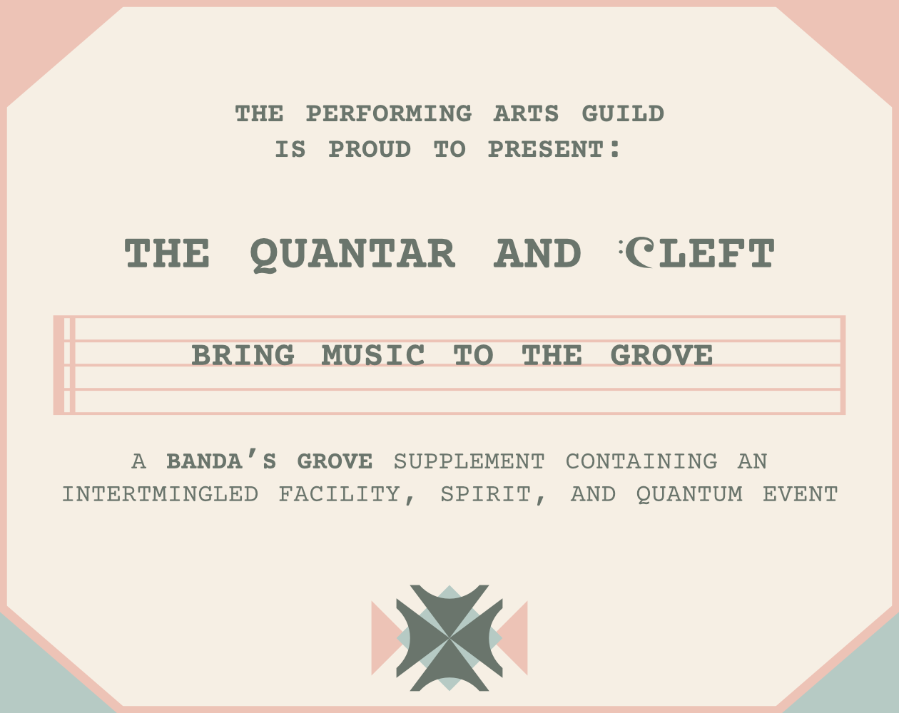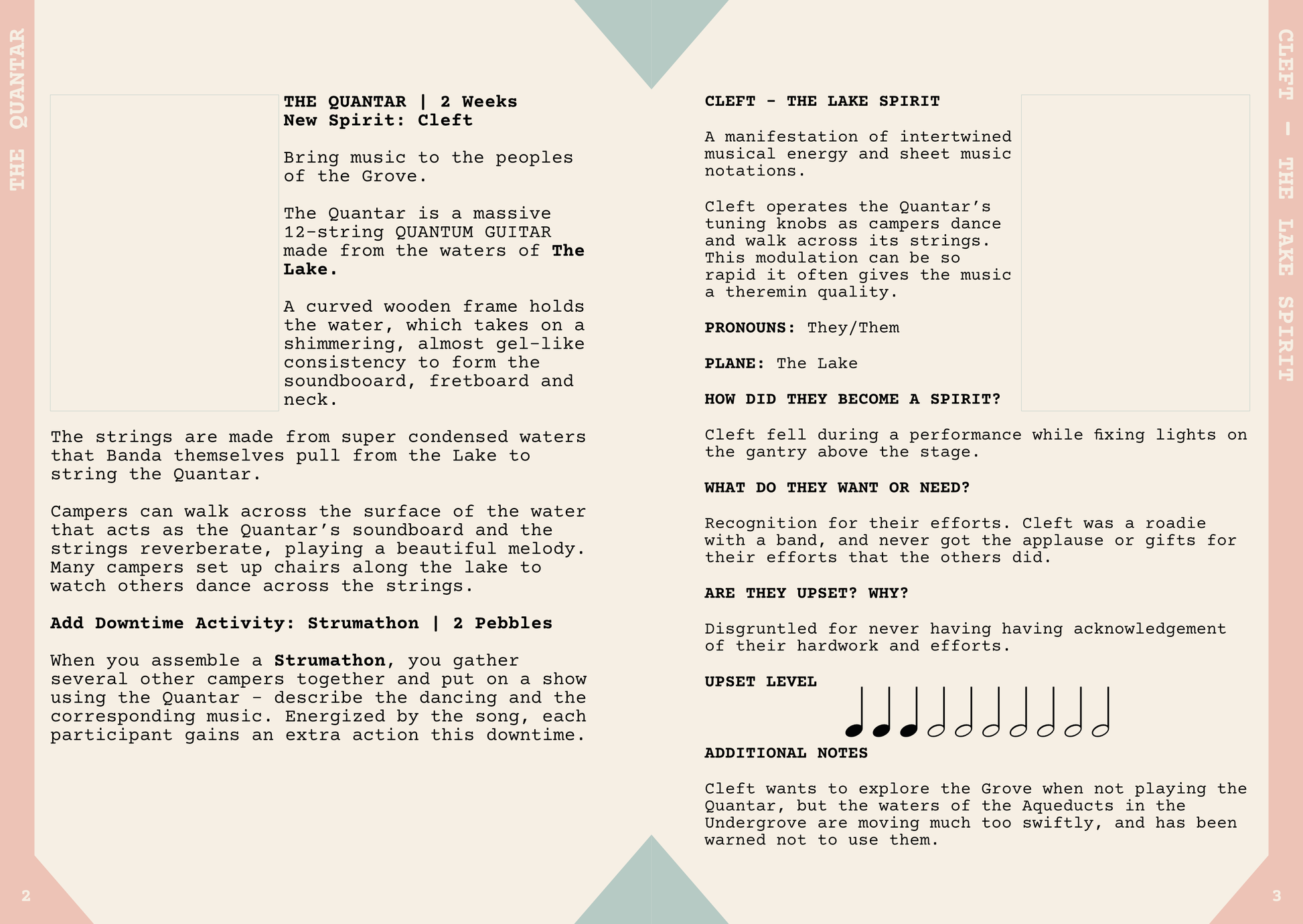 Cleft, a spirit of intertwined musical energy runs the Quantar giving it a theremin like quality, but is sad they cannot explore the Grove because the Aqueducts that run beneath it have become dangerous!