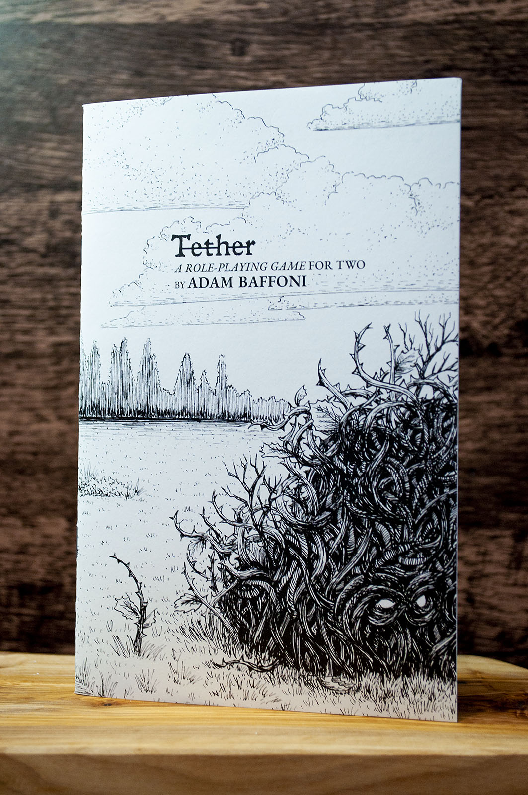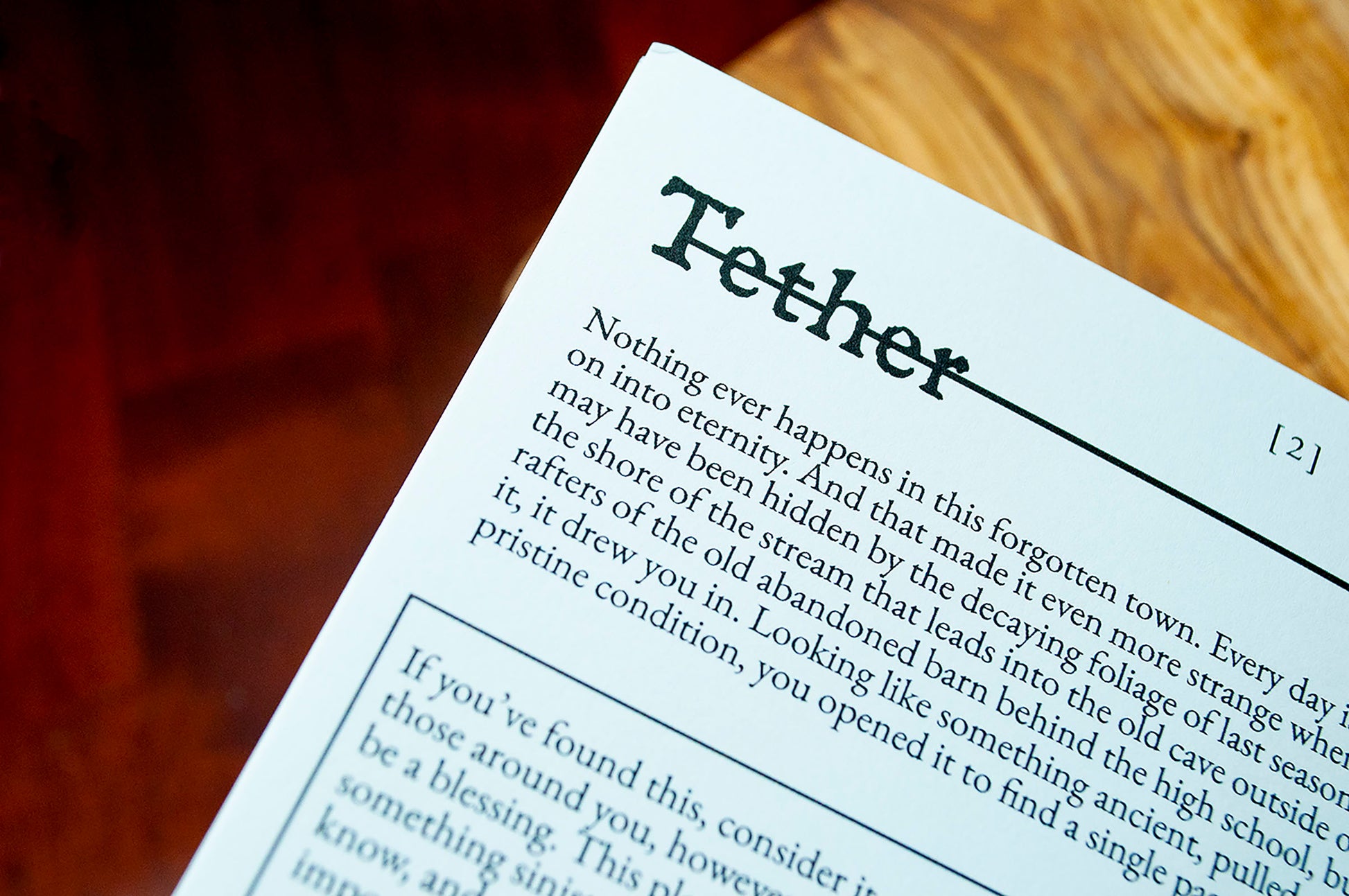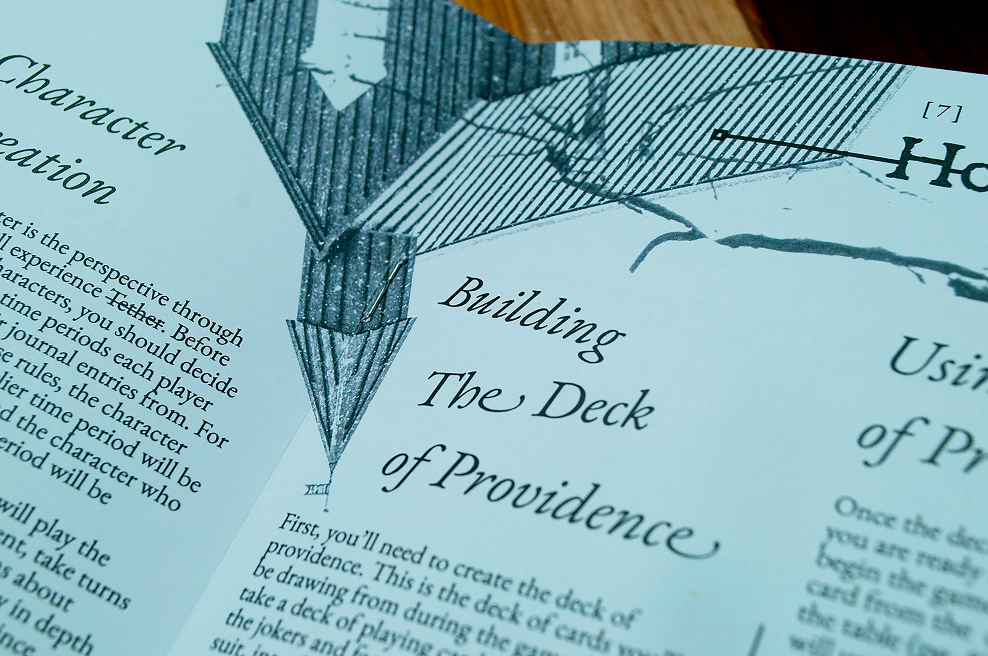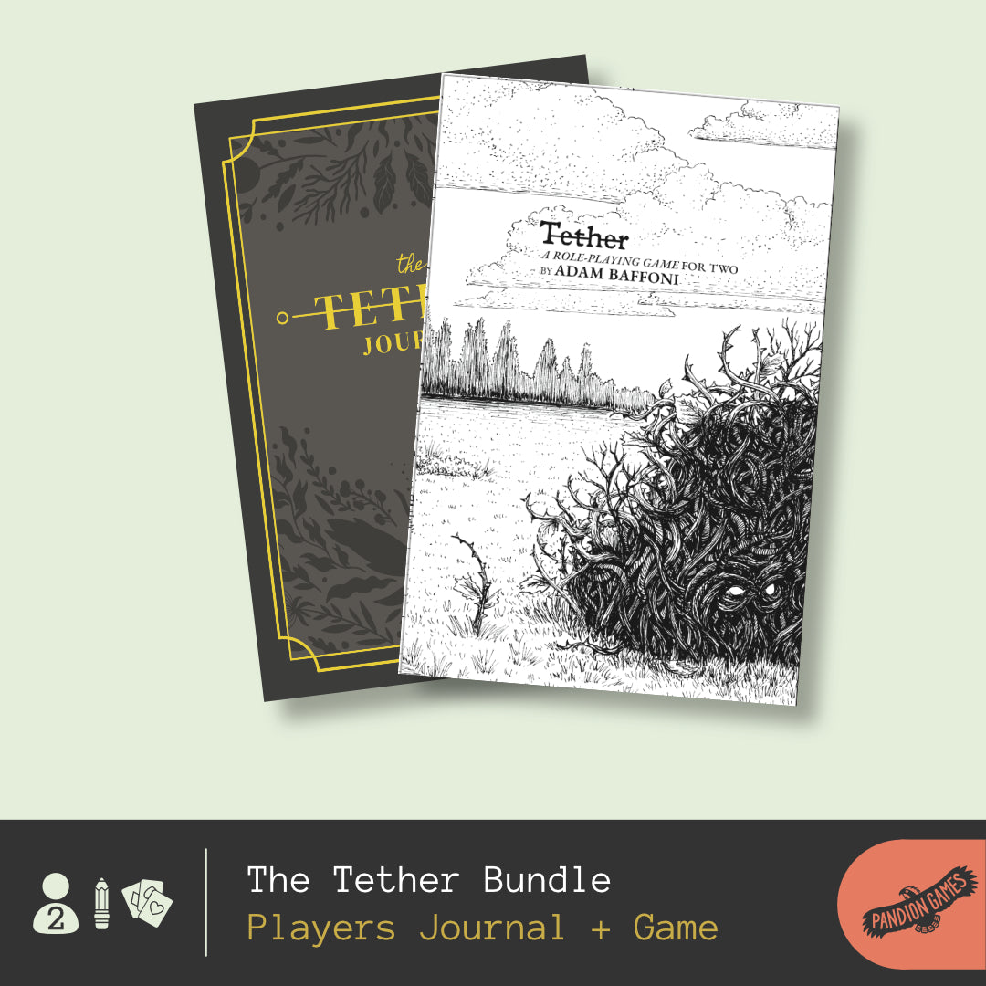 Tether is a role-playing game for two players that is played through the process of writing journal entries. Each player will take on the role of a character living in the same rural town, during different time periods. The two characters are connected by a journal known as The Tether, which allows them to write notes to each other through time. The two players (and characters) will work together to discover the secrets of an ancient being that haunts the town. Players will take turns drawing a card from a deck which is associated with a prompt, then using that prompt to write a journal entry. Over the course of 16 entries, the two will play out a story of suspense, horror, and possibly triumph.